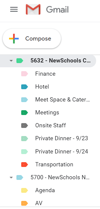 Event planners regularly get flooded with emails. Whether it’s from clients, teammates, or vendors, it can be a lot to sift through. I highly recommend creating folders in your email and not just having everything sit in your inbox. I like to organize folders by program, then create bucket subfolders (ie – hotel management, entertainment, food & beverage, AV, transportation, etc). It is a life saver when you’re managing multiple events at one time and have emails coming from various sources.