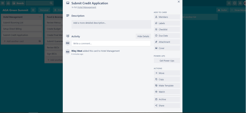 There’s a lot of ways you can create and manage lists, and it will ultimately depend on your preference. I use Trello and create a Board for each event I am working on. Within each Board, you can create different task buckets (ie – hotel management, food & beverage, AV, etc), then create subtasks within those buckets. You can add deadlines and assign other teammates to tasks. It’s very easy to use and really handy to help you stay on track of everything.
